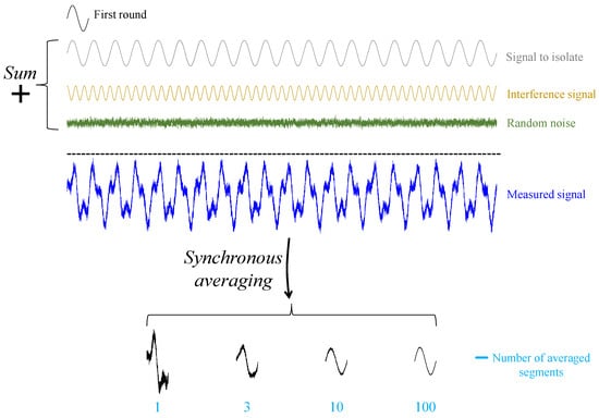 The goal of synchronous averaging is to isolate the vibrations of the component of interest. It does so by improving the signal-to-noise ratio via reduction interferences from other rotating components [33,34] and random noise [35]. Figure 7 illustrates the ability of synchronous averaging to isolate the vibrations of interest.