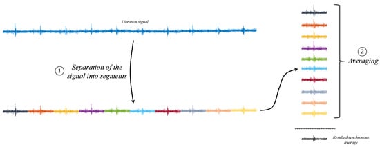 In synchronous averaging, the signal is divided into consecutive segments corresponding to complete rounds of the shaft, and these segments are then averaged together [34,36]. This process is illustrated in Figure 8.
