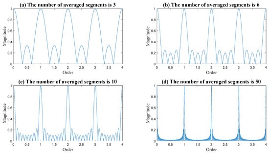 The reduction in interference signals was analyzed in several studies, including Refs. [34,37]. Concerning the sampled infinite continuous signal, synchronous averaging creates a filter that isolates the complete orders of interest, as depicted in Figure 9. When the number of averaged segments is increased, the filter becomes more selective [38].