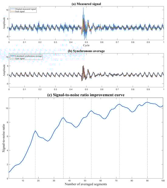 Figure 10 demonstrates the effectiveness of synchronous averaging on gears. In Figure 10a, the measured signal is depicted alongside the gear signal. Due to interference from the other wheel and random noise, the measured signal differs from the gear signal. After synchronous averaging, as shown in Figure 10b, most of the interferences and random noise are reduced; thus, the synchronous average resembles the gear signal. Figure 10c illustrates the improvement in signal-to-noise ratio as a function of the number of average segments. As the number of segments increases, the effect of random noise is reduced. The number of teeth on the other wheel is 18; therefore, its interferences are eliminated when the number of segments is an integer multiple of 18. This is because the other wheel’s orders align precisely with zeros, similar to the zeros in the filters illustrated in Figure 9. This example demonstrates the possibility of choosing a number of averaged segments that completely eliminate an interfering signal [36].