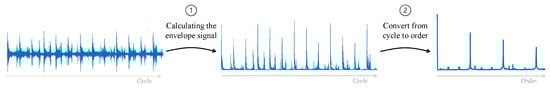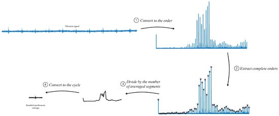 Regarding the statement, “most of the information about the health status is concentrated in a finite number of frequencies due to the periodic nature of the rotation”, synchronous averaging can also be calculated via the order domain by extracting orders of interest. As depicted in Figure 11, the signal is converted to the order domain, and then the values of the integer orders are extracted. After division by the number of averaged segments, the signal is converted back to the cycle domain. The resulting signal is the same synchronous average calculated using averaging in Figure 8 [2]. This analogous process demonstrates that synchronous averaging is a procedure that isolates a finite number of orders of interest of the monitored component, where most of the information about the health status is concentrated.