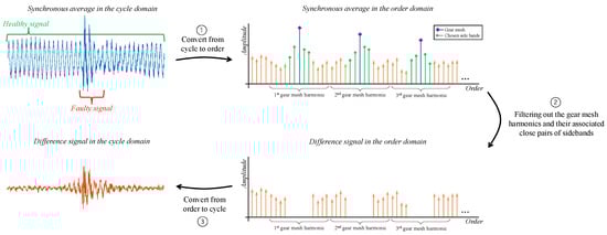 Gear mesh vibrations dominate the synchronous average even under a healthy state, masking the faulty signal. This masking effect can be addressed by analyzing the difference signal [39]. The difference signal is calculated by filtering out the gear mesh harmonics and their associated close pairs of sidebands, as depicted in Figure 12 [9]. The number of filtered sidebands can be determined via trial and error; typically, two pairs surrounding the gear mesh harmonics is a reasonable value.