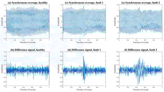 In Figure 13, the effectiveness of calculating the difference signal is demonstrated. Two synchronous averages of two faulty cases are depicted in Figure 13c,d. The fault is not visible in these figures. However, after calculating the difference signal, the fault becomes clearly visible. For comparison, a healthy case is depicted alongside.