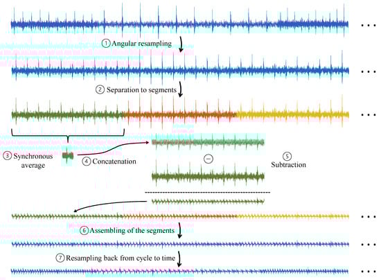As depicted in Figure 14, for each synchronous component that needs to be filtered out, Dephase performs the following steps: (1) the signal is angularly resampled according to the desired shaft speed, and then (2) the signal in the cycle domain is divided into long segments. (3) For each long segment, the synchronous average is calculated, and then (4) concatenated to the original length of the long segment. Afterward, (5) the concatenated signal is subtracted from the original signal, and then (6) the long segments are assembled. Finally, (7) the signal is resampled back to the time domain. This process is repeated for each interfering synchronous component, and in the end, the signal of the diagnosed component remains.
