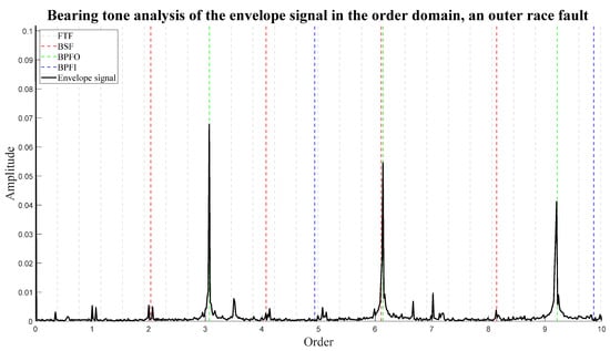 The bearing tones can be calculated using Equations (3)–(6) [7,15]. Figure 17 illustrates an example of these orders for an outer race fault. is the fundamental train frequency, is the ball-spin frequency, is the ball-pass frequency outer race, is the ball-pass frequency inner race, is the shaft speed, is the rolling element diameter, is the pitch diameter, is the bearing contact angle, and is the number of rolling elements. For analysis in the order domain, .