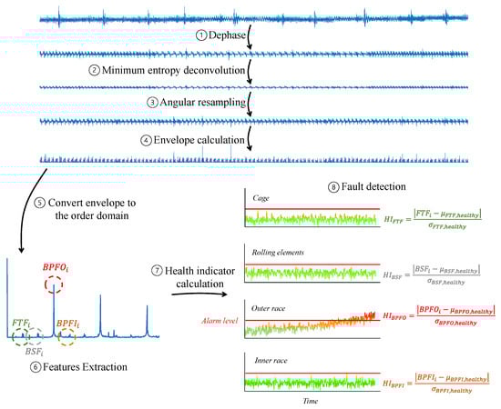 Figure 19 illustrates an optional diagnostic process of a roller bearing. Initially, (1) interferences of synchronous components such as gears are attenuated using Dephase. Then, (2) In many cases of incipient faults, signal processing techniques, such as minimum entropy deconvolution [56,57], are employed to enhance the fault signature. Following (3), the signal is angularly resampled according to the shaft’s bearing. (4) The envelope signal of the bearing is calculated, followed by (5) conversion of the envelope from the cycle to the order domain using discrete Fourier transform or power spectral density calculation. (6) Now, based on the parameters of the bearing, the bearing tones are extracted as features for fault detection. (7) Next, similar to gear diagnosis, based on health records, the health indicator for each type of fault is computed. (8) When the health indicator crosses the alarm level in any of them, the algorithm alerts about a fault in the bearing, as well as its type (cage fault/rolling element fault/outer race fault/inner race fault).