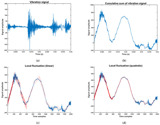- Step 3: The trend is estimated in each segment. This trend calculation is conducted by the least-squares fit of the time series and subsequent estimation of the variance as [40]:for each signal segment , andfor . In both cases, represents a fitting polynomial in segment . The possibilities for the polynomial order are linear, quadratic, cubic, or higher-order polynomial. This fitting polynomial leads to different orders of DFA known as DFA1, DFA2, DFA3, … [45]. An example of DFA of order one, or linear DFA, is shown in Figure 1c, and the corresponding DFA of order two, or quadratic DFA, is shown in Figure 1d for a vibration signal.