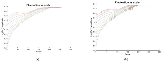 DFA enables the estimation of the slope in , representing the fluctuation function, where n corresponds to a range of time scales. In particular, represents the slope of the least-square regression line fitting vs. . Multi-fractal approaches calculate the fluctuation function considering a positive and negative range of q, including . In this way, positive q values amplify the contributions of larger amplitude fractal components, while negative q values emphasize smaller amplitude fractal components. This procedure leads to calculating the slope as a function , also known as the self-similarity coefficient. In [44], the calculation of using the first derivative has been attempted. However, minimizing the noisy variability of is necessary. This minimization implies estimating in maximally overlapped blocks of size n that are overlapped samples. An example of a fluctuation calculation using non-overlapped and overlapped windows is shown in Figure 2. The fluctuation was calculated for a range of integers q between −5 and +5. A smooth fluctuation representation is obtained with maximally overlapped windows as shown in Figure 2a. In contrast, a noisy representation of the fluctuation is obtained using non-overlapped windows, as shown in Figure 2b. The limitation of using maximally overlapped windows is the high computational cost, making this approach infeasible for long time series. However, in [44], an efficient algorithm for solving this problem is proposed. Such an algorithm is briefly presented in the following paragraph.