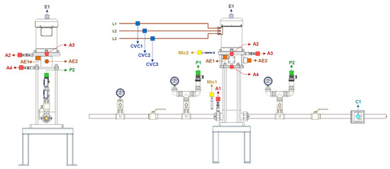 Sensor location for the centrifugal pump. The accelerometer sensors are A1, A2, A3, and A4. The sound signals are recorded with microphones Mic1 and Mic2. The sensors for acoustic emission signals are AE1 and AE2. The current sensors are CV1, CV2, and CV3. The sensor for rotational motion is a rotary encoder E1 and C1 is a flow meter.