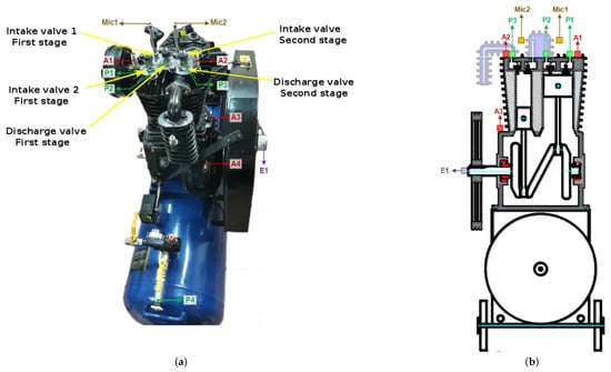 Sensor location for the reciprocating compressor. (a) Actual view of the sensor’s location. (b) Schema showing the sensor’s location for the reciprocating compressor. The vibration signal is recorded with accelerometers denoted A1, A2, A3, and A4.