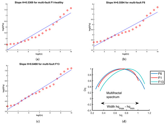 Features from detrended fluctuation analysis for a vibration signal. (a) Hurst exponent for a signal from the compressor multi-fault F1 (healthy), (b) Hurst exponent for a signal from the compressor multi-fault F6, (c) Hurst exponent for a signal from the compressor multi-fault F13, (d) fractal spectrum for faults F1, F6, and F13.
