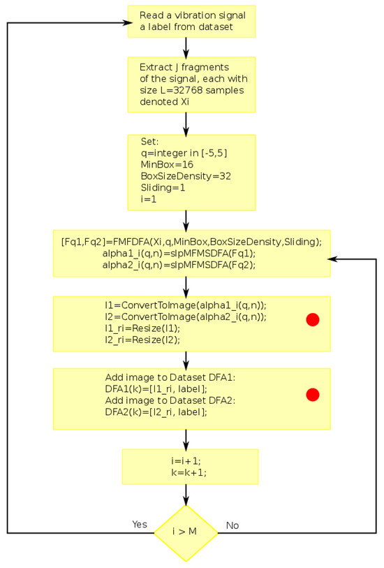 Feature extraction method. The process starts with and runs until all files in the vibration signal dataset have been processed. A set of fragments is extracted from each signal. The steps labeled with a red dot are modified when the features are intended for classification using classical machine learning models. In that case, the arrays and are not converted to images but are resampled to obtain two arrays of size . Each array is reshaped as a vector and concatenated with the corresponding label to obtain the feature dataset DFA1 (or DFA2).
