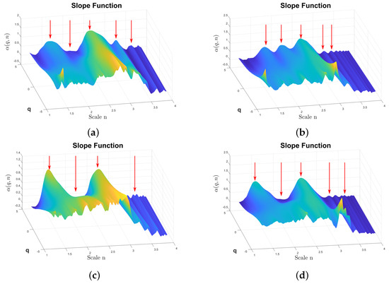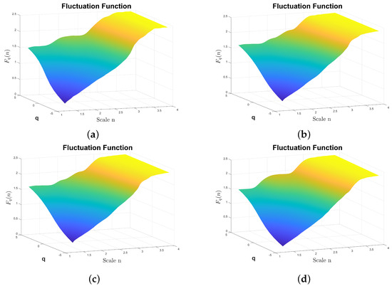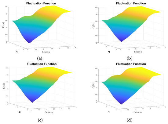 - Step 5: The scaling structure of the fluctuation function can be estimated from the log-log plots of as a function of n considering several values of q. In time series long-range power-law correlated, when n has a large value, increases as a power-law [46]:where the generalized Hurst exponent corresponds to the slope in the log–log plot, usually denoted as H.