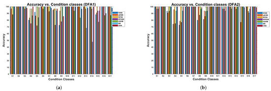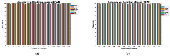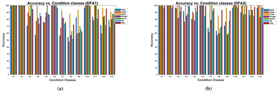 The classification accuracy provided by the extracted features was validated using a set of classical machine learning models, including random forests (RFs) [56], particularly random forest models with subspace discriminant learners (RFSDs), random forest subspaces with nearest neighbors (RFKNN), support vector machines (SVMs) with Gaussian kernel (GSVM) [57], k-nearest neighbor (kNN) with a distance weighting function (wKNN) [58], and neural networks (NNs) [59]. Validation is performed using one dataset for the centrifugal pump (faults described in Table 1) and two datasets for the reciprocating compressor (faults in Table 2 and Table 3). The DFA1 and DFA2 feature sets for each vibration signal dataset were validated regarding their classification accuracy. Since both DFA1 and DFA2 feature arrays have a size of , which is too large for input into classical machine learning models, these arrays were resampled to achieve a more manageable size of , which is fed to the classical machine learning models. Each of the six feature arrays obtained from each signal is considered a separate feature example, and the label associated with the signal used for its calculation is assigned.