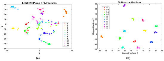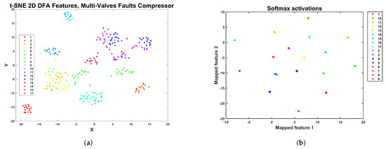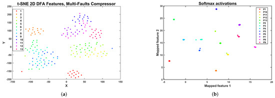 In [36], an application involving multi-fractal detrended fluctuation analysis (DFA) for detecting faults in valves of a reciprocating compressor is reported. During preprocessing, the vibration signal’s empirical wavelet transform (EWT) was combined with state-adaptive morphological filters (SMFs). Then, the modal function was quantitatively analyzed using MFDFA aimed at fault detection. Although the method can identify the fault type in the valve, it depends on a complex preprocessing methodology. A feature extraction method that combines variational mode decomposition (VMD) and MFDFA in a reciprocating compressor is reported in [37]. The vibration signals are decomposed using VMD. Each resultant intrinsic mode function (IMF) is analyzed using MFDFA, and a set of eigenvectors providing higher recognition accuracy is selected using principal component analysis (PCA). The method is evaluated for detecting four types of valve faults in a reciprocating compressor. In [38], multi-fractal spectral parameters of four sensor signals recorded from a centrifugal pump under different operating conditions are extracted as features fed to a backpropagation neural network. Then, the outputs from the neural networks are fused using the Dempster–Shafer evidence theory to attain the final diagnosis. The research concerning DFA, MFDFA, and the combination of EMD with MFDFA shows that these features are sensible to noise in the vibration signals [39]. Their application for fault detection in centrifugal pumps and reciprocating compressors heavily relies on using complex denoising preprocessing methodologies.