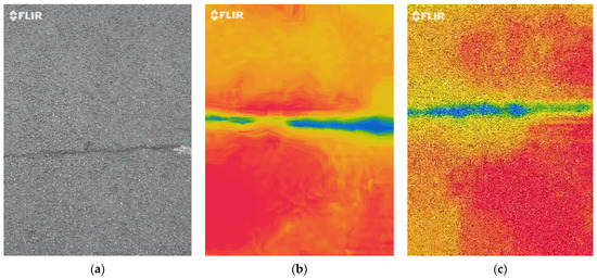 In this study, the following three images were used for data acquisition: digital images; infrared (IR) images; and Multi-Spectral Dynamic Imaging (MSX) images. To acquire digital image data, a mobile phone was used and an FLIR One Pro LT camera from FLIR (West Malling, UK) was used to collect IR images. This camera has an additional MSX imaging option wherein visible light details are added onto the thermal image for clarity enhancement. FLIR MSX adds visible light details to thermal images in real time for greater clarity, embedding edge and outline details onto thermal readings. Unlike image fusing (the merging of visible light and thermal image), MSX does not dilute the thermal image or decrease thermal transparency. The collected images each have different image characteristics, and Figure 1a shows a digital image. The IR image shows the distribution of thermal energy, and cracks can be found because there is different thermal energy between the crack and the pavement (see Figure 1b). The MSX image is a more enhanced IR image, and it can be seen that the intensity of color between pixels is enhanced compared to the IR image (see Figure 1c). In this paper, by analyzing three different images with the same algorithm, it can be determined which pavement categories were well identified. The specification details of the infrared thermal camera are shown in Table 1.
