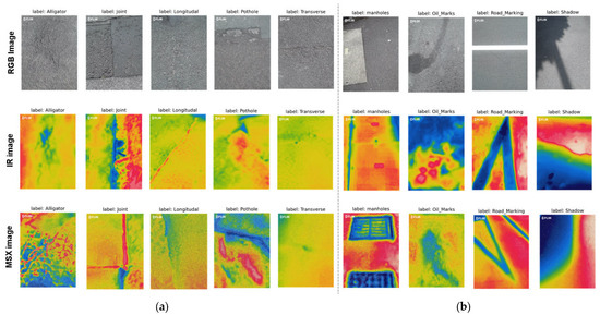 - In total, 13,500 digital, IR, and MSX images were collected for the following nine categories of the pavement: longitudinal cracks, transverse cracks, alligator cracks, potholes, shadows, joints, road marks, manholes, and oil marks. Nine categories were automatically classified with the DarkNet-19 classifier.