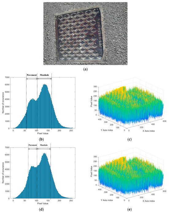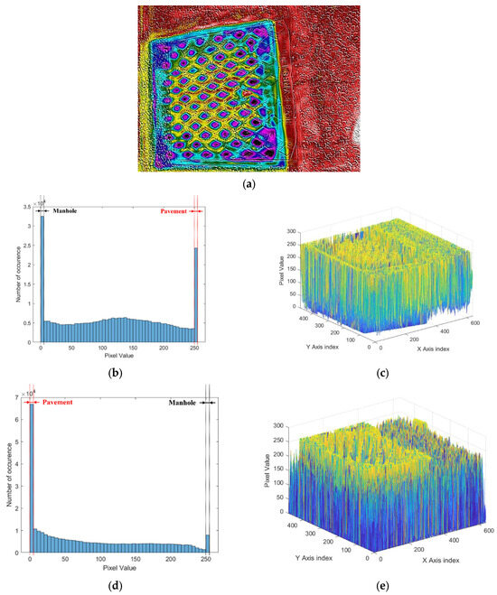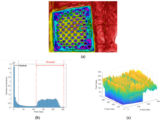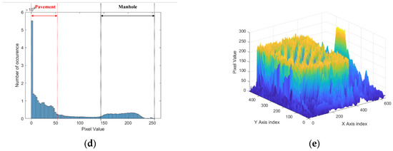 Figure 4 shows an example of a histogram analysis for IR images of manholes. Since the temperature difference between the manhole and the road is different, Figure 4a shows the color distribution between the two materials. Figure 4b shows the histogram of the red scale, where 255 represents pure red and 0 represents black color. Pixels representing manholes are intensively distributed between red scales 0 and 25, and pixels representing pavements are widely distributed between 115 and 255. As shown in Figure 4c, when the red scale distribution according to the pixel position is viewed in three dimensions, the position and shape of the manhole are more clearly revealed. Pixels representing the pavement have a high red scale, and pixels representing manholes have a red scale close to zero. Figure 4d shows the histogram of the blue scale, which has an opposite result to the red scale histogram. Pixels representing road pavements are distributed between 0 and 55 on the blue scale, and pixels representing manholes are distributed between 140 and 255. The three-dimensional histogram of the blue scale also shows the opposite result to that of the red scale (see Figure 4e). It shows that pixels representing the manhole tend to reach values close to 255 on the blue scale, and pixels representing the pavement have values close to 0.