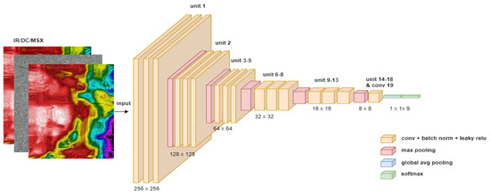 DarkNet-19 is a DarkNet structure with 19 basic units, each of which consists of a three-dimensional convolution layer plus a batch normalization layer and a leaky relu activation layer, with different parameters such as filter/output size and stride [27,28] (see Figure 6). Convolution layers are responsible for feature extraction and dimensionality reduction (as depicted in the graph), while batch normalization scales learnable weights and biases of each neuron into (0, 1, inclusive), which makes training faster and more stable in terms of gradient update. Finally, leaky relu is a preferred choice of activation function for the result and behaves more stably in the training process of deep neural networks with a large number of training iterations compared to classic relu or sigmoid. Until this layer, all weights and biases start from pre-trained values. After the last (19th) single convolution layer, Global Average Pooling is used to replace classic fully connected layers to generate class prediction confidence. Finally, based on the confidence, a softmax layer generates final class predictions. Notice that the input/output layer dimension needs to be updated based on data type (on summer days, nine classes, otherwise eight).