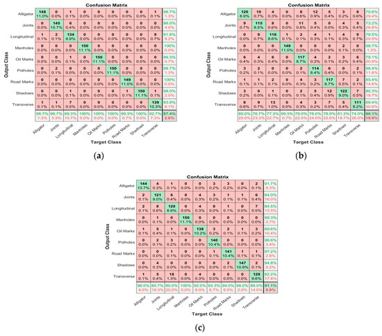 Figure 6 shows the results of DarkNet’s confusion matrix for nine categories of pavement damage. The digital image showed an average accuracy of 97.4% for the nine categories (see Figure 7a). The detection result of longitudinal cracks was the lowest at 89.3%, and manholes, oil marks, potholes, and shadows showed 100% accuracy. Figure 7b shows that the average accuracy of the nine categories is 80.1% as a result of DarkNet’s confusion matrix for the IR camera. The transverse crack showed the lowest accuracy at 74.0%, and the highest accuracy was 81.3% with the shadow. The results of the MSX images showed that the average accuracy of the nine categories was 91.1% (see Figure 7c). The maximum accuracy was 100% with the manhole, and the minimum accuracy was 80% with the longitudinal crack.