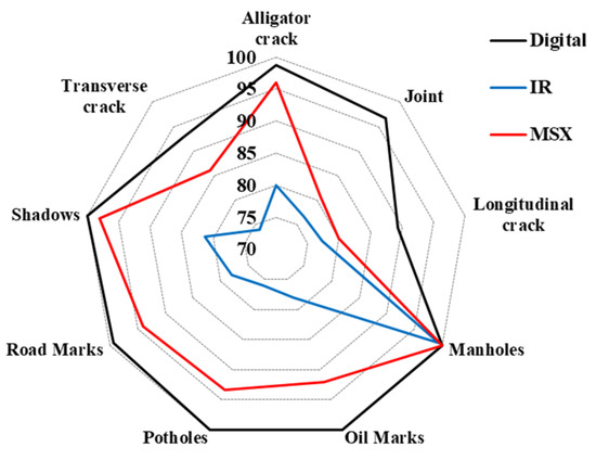Figure 8 shows a polygon chart for a detailed comparison of the results of three images. It can be seen that the digital image has the highest accuracy in all categories, and the manhole has the highest accuracy in all images. The tendency of accuracy in each category was found to decrease and increase similarly. Among damages, potholes showed relatively high accuracy except for the IR image results, but longitudinal and transverse cracks showed low accuracy in the results of all images, compared to the other categories. In particular, the classification accuracy of transverse cracks in IR images was the lowest. The MSX images had higher accuracy in all categories than the IR images, with about 11% higher accuracy on average. The MSX image had a slightly lower accuracy than the digital image result, and it showed about 6% lower accuracy on average. Therefore, if supplementary analysis is required for DarkNet analysis of digital images, analysis through MSX images can ensure high accuracy. MSX images can therefore be used as a dataset to complement digital images in automatic damage detection systems.