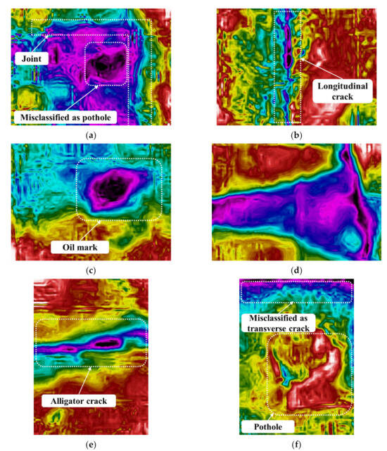 MSX images have a higher accuracy than IR images and lower accuracy than digital images, and examples of misclassified MSX images are shown in Figure 11. Infrared thermal imaging is greatly affected when there is water seeping into the pavement. Figure 11a is an MSX image of the pothole, but it is misclassified as a transverse crack due to the water effect around the pothole. In Figure 11b, the area maintaining low temperature is widely distributed because water permeates the pavement around the transverse crack. Therefore, this MSX image was misclassified as a longitudinal crack due to the scattered water. Figure 11c is an MSX image of the shadow, but since the thickness of the shadow is small, it is misclassified as a transverse crack. If the difference in thickness and temperature between the crack and the shadow is not large, the shadow can be misclassified as a transverse crack. Figure 11d is a road mark but is misclassified as a transverse crack. In the digital image, the road mark has a low color scale like white, and is distinguished from the pavement, but in the thermal infrared image, the temperature of the road mark is lower than that of the road pavement, so it is classified as a crack. Figure 11e shows alligator cracks that are distributed in the longitudinal direction but are misclassified as longitudinal cracks. The MSX images showed about 16% higher classification accuracy of alligator cracks than the IR images, detecting micro-cracks better than IR images. However, it is difficult to classify alligator cracks when micro-cracks are combined into a single shape of the image, as shown in Figure 11e. Figure 11f is an oil mark but is misclassified as a pothole. Potholes and oil marks are not only similar in shape, but in this case, the temperature is lower than that of the pavement.