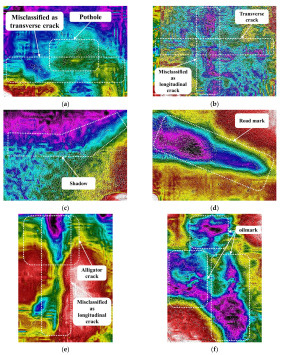 Misclassified MSX images. (a) Potholes: misclassified as transverse crack. (b) Transverse crack: misclassified as longitudinal crack. (c) Shadows: misclassified as transverse crack. (d) Road marks: misclassified as transverse crack. (e) Alligator: misclassified as longitudinal crack. (f) Oil mark: misclassified as pothole.
