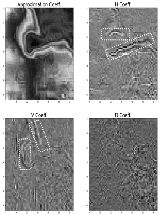 In this paper, an in-depth analysis was conducted to prepare a plan to reduce misclassification, and the results of the wavelet transform analysis are expected to be helpful in finding the direction of cracks in road pavements in the future. Wavelet transform is an effective tool for time-frequency analysis. The input image is subjected to a two-dimensional discrete wavelet transform (DWT). The image is decomposed into approximate, horizontal, vertical, and detailed coefficient matrices. The approximate coefficients represent low-frequency components, whereas the detailed coefficients (horizontal, vertical, and diagonal) represent the high-frequency components, which provide both high-frequency values for both the background and foreground, like edge and non-edge regions [29]. Figure 13 shows an example of the DWT of an IR image in the joint. The horizontal coefficient can physically filter out the horizontal components of a joint. Therefore, as shown in Figure 13, the horizontal coefficient can extract the horizontal boundary between the joint and the pavement. The vertical coefficient physically detects the vertical components of a joint. The pixels of the vertical components representing the joint in the IR image are detected by the vertical coefficient. The diagonal coefficient detects the diagonal components of the image, and the pixels representing the diagonal components of the joint are shown in Figure 13.