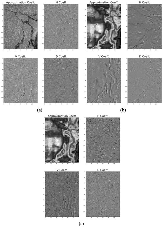 In the DarkNet results of the three images, the transverse cracks and longitudinal cracks corresponding to the damage of the pavement had lower accuracy than the classification accuracy of other categories. Detecting transverse, longitudinal, and alligator cracks in pavements is the ultimate purpose of this study and clearly identifying the directionality of cracks not only increases the classification accuracy but also contributes to future automatic crack detection studies using deep learning. Therefore, in this paper, an analysis was conducted to detect the directionality of the crack by wavelet transforming the alligator crack, which has horizontal, vertical, and diagonal components (see Figure 14). Alligator cracks in the digital image are clearly detected by the horizontal and vertical coefficients. In Figure 14a, horizontal components of alligator cracks are distributed in the upper part of the figure, and vertical components of alligator cracks are distributed in the lower part. Due to the nature of alligator cracks, there are inevitably many diagonal components, which are also clearly detected. In the IR image, the vertical component is clearly revealed, and the horizontal and diagonal components are also found in several places in the image, revealing the features of alligator cracks (see Figure 14b). In MSX images, the vertical components are observed more closely than in IR images. Since alligator cracks are spread throughout the image, the horizontal and diagonal components are also found widely in the image (see Figure 14c). Cracks are a typical damage feature of pavements, and the DWT results on the directionality of these cracks will increase the accuracy of classifying the crack itself, as well as the accuracy of classifying the type of cracks in future studies.