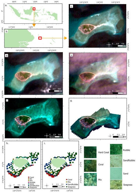 Research Area: (a). Indonesia; (b). Derawan Archipelago; (c). Landsat 7 2003; (d). Landsat 7 2011; (e). Landsat 9 2022; (f). Sentinel-2 2021; (g). UAV Multispectral 2021; (h). in situ Station in Derawan Island; (i) in situ Station in Derawan Island with 4 classification.