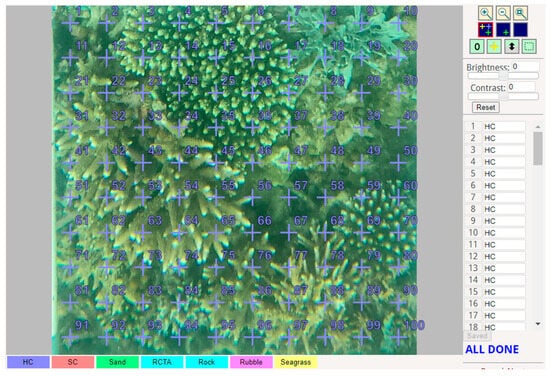 - Recapitulation and Validation of UPT Data and Multispectral Aerial Photography: To calculate the coverage of the coral reef ecosystem, the UPT (Underwater Photo Transect) data was processed using the Coral Net platform [41]. This UPT data, crucial for assessing the ecosystem coverage, involved capturing images with GoPro cameras and GPS sets for precise location data. Each image underwent a detailed analysis using a 10 × 10 grid pattern, totaling 100 points (Figure 3). At this stage, every UPT point represented a 50 × 50 cm area, providing a high-resolution view of the coral reef. This meticulous examination included classifying the benthic environment at each grid point into detailed categories such as hard coral, soft coral, sand, algae, rock, rubble, and seagrass. This comprehensive classification, as depicted in Figure 1h, facilitated an in-depth understanding of the diverse benthic habitats present in each image. Furthermore, the UPT point interpretation of the 50 × 50 cm areas served as a reference to upscale the analysis to larger areas of 10 × 10 m. In this scaling-up process, the classification scheme was simplified into broader categories: coral, sand-rubble, seagrass, and mixed bottom class (Figure 1i). This modification was essential for matching the UPT data with the grid used in Sentinel-2 multispectral aerial photography. This integration of fine-scale UPT analysis and larger-scale satellite data, along with the adjusted classification scheme, allowed for a more comprehensive monitoring and understanding of the coral reef ecosystem. It ensured that the ecosystem was analyzed in a detailed and multi-scaled manner, crucial for accurate ecosystem assessments and conservation efforts.
