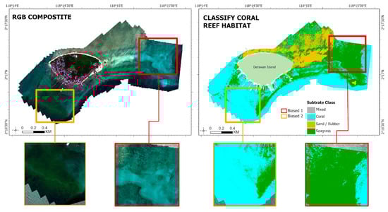 The best machine learning classification results from Landsat 9 and Sentinel-2 image data appear more relevant and acceptable than the best machine learning classification results from multispectral aerial pictures using the SVM method. The result is due to significant bias in the classification findings obtained from multispectral aerial photography picture data, and field data validation reveals that the substrate categorization deviates significantly in some spots. Figure 6 depicts bias in the multispectral aerial photography picture data, with two examples of bias in the coastal area of Derawan Island.