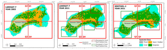 Our analysis demonstrated that the RF classification algorithm was supremely accurate, primarily due to its capability to process large-scale data sets. In this study, we identified four distinct benthic habitat types: mixed, coral reef, seagrass, and sand or rubble. Utilizing this classification, we embarked on a detailed mapping of coral reef habitats. This was achieved by analyzing satellite data from three different years: Landsat 7 imagery from 2003 and 2011, and Sentinel-2 imagery from 2021. The insights gained from this mapping exercise laid the groundwork for an extensive examination of the spatial and temporal changes in Derawan Island’s coral reef habitats, with a particular focus on alterations in their size and composition over the years.