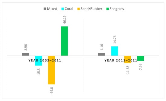The time series analysis of the benthic habitat on Derawan Island, illustrated in Figure 7, was derived from meticulous data processing. Our findings indicate a significant dominance of seagrass areas along the coastal region in 2003, occupying approximately 119.33 hectares and constituting approximately 34.13% of the island’s benthic habitat. The coral reef substrate, predominantly located around the island’s rim, covered an area of 111 hectares, accounting for 31.78%. Following closely, the sand/rubble areas spanned 112.5 hectares, making up 32.18% of the habitat. A detailed breakdown in Table S1 shows the mixed area being the smallest at 6.6 hectares, representing just 1.91%.