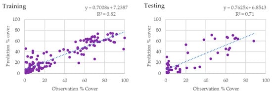 Figure 10 depicts the correlation between the observed and predicted percentage cover with a scatter plot, demonstrating a clear positive linear trend. The line of best fit for the training data is characterized by the equation y = 0.7008x + 7.2387, with an R-squared value of 0.8164, implying that the model successfully explains over 81% of the variance. This high level of variance explained indicates a robust predictive ability within the training context. Upon evaluation of the testing data, a similar positive linear relationship is evident, albeit with a modest reduction in the R-squared value to 0.7097. This best-fit line is represented by the equation y = 0.7625x + 6.8543. The observed reduction in the R-squared value, relative to the training phase, suggests a diminished, yet still substantial, predictive capacity when the model is applied to unseen data. Despite this diminution, the model maintains a commendable level of prediction accuracy, underscoring its utility in practical applications. Building on the established prediction model, Figure 11 extends the analysis to a temporal dimension, showcasing a time-series map of coral density across three distinct years: 2003, 2011, and 2021. This map provides a visual representation of the changes in coral density over the 18-year period, illustrating spatial patterns and trends within the benthic habitats of Derawan Island. In 2003, the map likely reveals a distribution of coral densities that corresponds to the initial baseline conditions within the study area. As we progress to 2011, the map reflects any shifts that have occurred over the eight-year interval, potentially showing changes in coral densities that may be attributable to various environmental factors or anthropogenic influences. By 2021, the culmination of the series, the map captures the latest state of coral densities, offering insights into the long-term evolution of the coral ecosystem. The changes depicted in the time-series map are underpinned by the predictive model’s accuracy, as previously discussed. The model’s capability to account for a significant portion of variance in the training and testing phases provides confidence in the reliability of the trends observed in the time-series map.