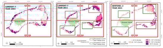 According to Figure 11, it is evident that the coral density on Derawan Island has undergone changes in various regions over an 18-year period. In 2011, there were fluctuations indicating both an increase and decrease in the extent and density of coral reef habitats. In comparison to 2003, quadrants 1, 2, and 4 experienced a decline in coral reef density in 2011. However, each quadrant exhibited distinct density changes, such as an average density increase from the 20–40% range to 60–80% in quadrant 1, and a decrease in average density from the >80% range to 40–60% in quadrant 2, as well as from the 20–40% range to <20% in quadrant 4. On the other hand, quadrants 3 and 4 witnessed an expansion in the coral reef habitat areas in 2011. In finer detail, the increased area was accompanied by an average increase from the 60–80% class to >80% in quadrant 3 and from the 20–40% class to 40–60% in quadrant 4. Overall, the period from 2003 to 2011 was characterized by a predominant reduction in the coral reef habitat area.