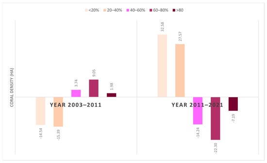 The overall analysis of coral density on Derawan Island reveals distinct trends between the periods 2003–2011 and 2011–2021 (Figure 12). From 2003 to 2011, there was a notable reduction in coral density within the <20% and 20–40% classes. Conversely, there was an expansion in the coral density area for classes exceeding 40%, with the most substantial increase observed in the 60–80% class. In contrast to the preceding period, the 2011–2021 timeframe demonstrates an inverse pattern. During this period, there was a significant growth in area for the 20% and 20–40% density classes. Simultaneously, a decrease in area was noted in density classes exceeding 40%, with the most substantial decline occurring in the 60–80% density class. In conclusion, the analysis of the coral density on Derawan Island indicates contrasting trends between the periods 2003–2011 and 2011–2021, marked by a decline in certain density classes and an increase in others, highlighting the dynamic nature of coral habitats over time.