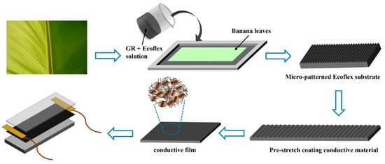 However, the microstructured films mentioned above were fabricated by replicating the structure of patterned silicon templates produced by a photolithographic technique, which is costly and time-consuming. Instead, we found that a regular, parallel vein-like structure exists naturally in banana leaves, and we incorporated this microstructure into the sensor. A flexible substrate was prepared by flip-molding a naturally occurring plantain leaf, which formed the lower conductive structure. The substrate is capable of adapting to strain through stretching and recovery of its parallel vein-like microstructure []. An upper conductive structure layer was produced by multilayer graphene (MLG) and carbon nanotube (CNT) composites. Consequently, we fabricated a flexible strain sensor with a double-layer conductive network with a bionic parallel vein-like structure. The sensor has a wide sensing range of up to 580%, as well as ultra-high sensitivity and fast response characteristics. Furthermore, an MLG-Ecoflex/MLG-CNT/MLG-Ecoflex multilayer stacked pressure sensor was prepared using a bionic parallel vein-like structure. When subjected to pressure, the sensor increases the conductive channels due to the deformation of the microstructure, resulting in an increase in current change. The pressure sensors exhibit excellent linearity and a sensitivity of 0.344 kPa−1.
