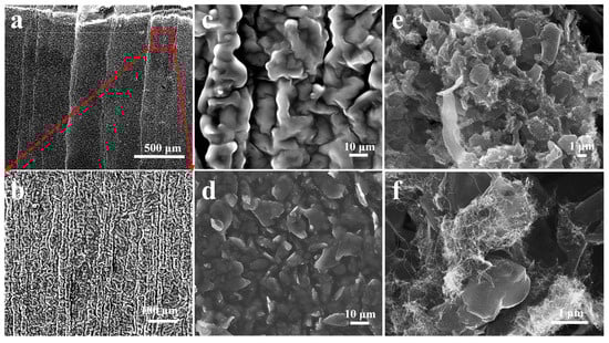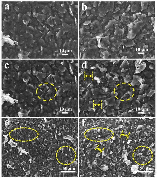 To delve deeper into the potential mechanism behind the sensing properties of flexible strain sensors with bionic parallel vein-like structure based on a double-layer conductive network, the upper conductive layer’s surface morphology was characterized under different degrees of strain using scanning electron microscopy (SEM).