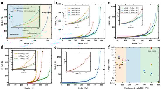 (a) Sensing characteristic curve of the stretch strain sensor with and without microstructure. Relative resistive-strain variation curves of strain sensors (b) with MLG concentrations of 0 wt%, 1 wt%, 3 wt%, and 5 wt% in the Ecoflex polymer (lower conductive layer), and (c) with 2:1, 4:1 and 9:1 mass ratios of MLG to CNTs in the upper conductive layer. (d) At different unit contents of the upper conductive layer composites under MLG to CNT mass ratio of 4:1. (e) Sensing characteristics curve of the best-performing stretch strain sensor. (f) Comparison with reported research works.
