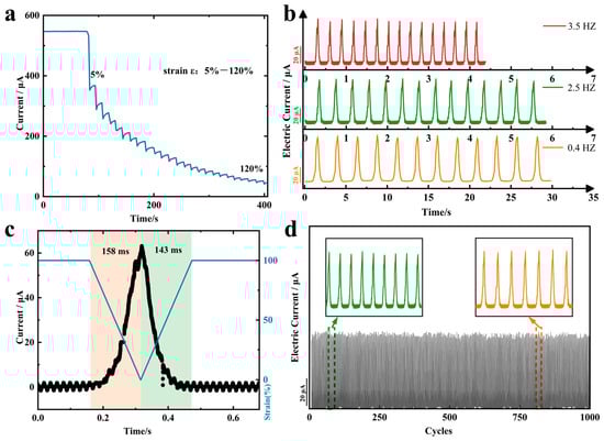 (a) Dynamic response of current signal for step strain in the range of 0–120% strain. (b) Variation of current signal of strain sensor at selected frequency at 100% strain. (c) Response time and relaxation time of strain sensor. (d) Cyclic durability curve of the strain sensor at 100% strain.