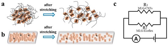 Schematic diagram of the (a) upper and (b) lower conductive layers before and after stretching and (c) a schematic diagram of parallel resistance.