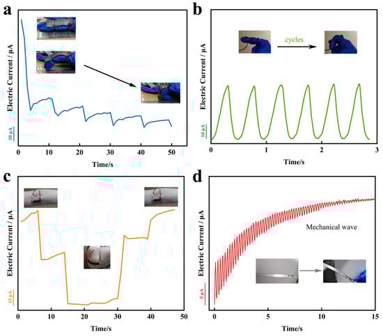 When monitoring human movement or other practical applications, stretchable sensors need to be sensitive and repeatable enough under both large and small strains. The above experimental results show that the strain sensor has good linearity, excellent stretchable performance and high sensitivity in both small and large strain regions. In order to demonstrate the effectiveness of the sensor in human motion monitoring, the optimal sensor was attached to human joints to monitor the large deformations and small movements of the skin and muscles during finger and elbow joint movements. Different flexures of the finger and elbow joints resulted in different magnitudes of change in the current signal response (Figure 7a,c), and the magnitude of change in the current signal response to joint motion at the same flexure was consistent (Figure 7b). This indicates that the sensor is able to accurately respond to movements at human joints and has the potential to monitor the correctness of human locomotor movements. In addition, by attaching the sensor to a steel ruler and continuously monitoring the resonant motion of the ruler (Figure 7d) the sensor was able to monitor the changes in the mechanical waves in real time, which further demonstrates that the strain sensors in this work have excellent response time and sensitivity and are capable of a wide range of applications in the field of human sensing.