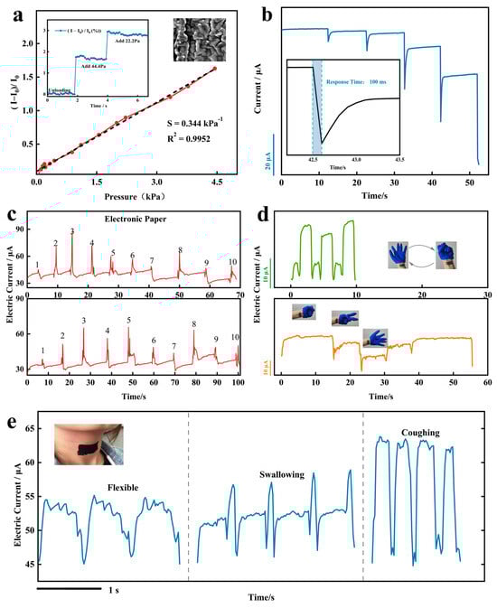 Furthermore, following the coating of MLG-CNT composites on a flexible substrate to produce a conductive film, the two conductive films were oriented face-to-face and connected via silver adhesive electrodes and wires to generate a pressure-sensitive sensor. The pressure response curve is displayed in Figure 8a. The groove structure present on the parallel vein-like microstructure on the flexible substrate (Figure 2c) is able to deform the pressure-sensitive sensor when it is subjected to pressure, resulting in a rapid increase in the contact area of the conductive layer, which improves the sensitivity and sensing range of the sensor []. Referring to the previous experimental method for pressure sensing curve testing [], the sensitivity can be defined as: , ; where I is the sensor’s current when the pressure is applied, I0 is the initial current when the sensor is not subjected to force, ΔI is the relative change of the current, and P is the change in pressure. The inset in Figure 8a illustrates the alteration in relative current after sequentially increasing small intensity of pressures of 44.4 Pa and 22.2 Pa in sequence. It shows the ability of the sensor to respond at low strain range. The pressure response curve obtained through experimentation displays good linearity. After fitting, the sensitivity of the pressure-sensitive sensor is S = 0.344 kPa−1, and its response time is 100 ms (Figure 8b). The excellent sensing performance of this sensor is capable of accurately monitoring even smaller strains.