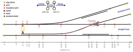 A popular method to monitor the track superstructure in general is to measure the accelerations caused by the interaction between vehicles and tracks, either with train-borne or track-side sensor systems [,]. In the case of train-borne mounting, large areas of the network can be covered with just a few sensor units, but this requires accurate vehicle positioning. Track-side sensors allow all train passes per switch to be recorded, providing greater volumes of data and a complete picture of the actual load on the switch. Acceleration is often recorded directly at specific critical components (e.g., nose). Network operators can monitor their infrastructure independently, without the need to coordinate with vehicle operators. Both types of acceleration signals simultaneously contain information on track components (rails, sleepers, ballast, etc.) as well as on the train (wheel shapes, bearings, load, etc.). Information on the condition of components whose location allows for good signal transmission (often equivalent to a short distance from the sensor) is more visible in the recorded signals. Any local discontinuity in the contact between wheels and rails, e.g., caused by track defects such as squats or track discontinuities such as joints and crossings, show up as transient impact events in the data []. Monitoring for such impact events is important in order to be able to intervene at an optimal time when wear or faults occur (e.g., see [] for the timing of squat intervention). The characteristics of an impact event depend on its origin and the parameters of the system. One of the main challenges in analyzing such acceleration data is to assign impact events and overall trends as clearly as possible to their origin.