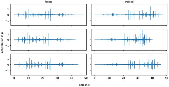 Figure 3 shows the six bogie passes from stop block to stop block on the straight track, measured by one vertical (skywards) acceleration sensor, that are considered in this study. Three measurements are in the facing direction, while the other three are in the trailing direction. The different lengths of the measurements are due to variations in the bogie speed, which remains below 1.2 m/s for all measurements.