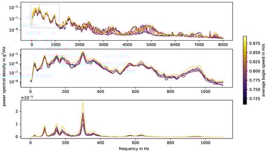 Power spectral density of whole acceleration measurement series, colored by average speed (calculated over the whole speed measurement series). The number of samples per window in the calculation of Welch’s method is 4096 and the windows overlap by 2048 samples. The lower two plots zoom in on the frequency range up to 1100 Hz, with densities displayed in log and linear scale, respectively.