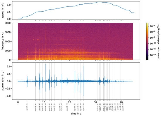 A single measurement on the straight track in facing direction. All known impact events according to Figure 1 are labeled (“impact event origin: axle”) at their start times.
