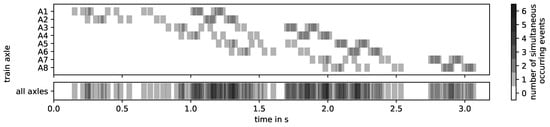 The impact events in the presented experiment are clearly separated from each other in time. This is not necessarily the case in practice (cf. Figure 6), as the number of impact events increases with the number of axles and the time between events is shorter. In [], impact events in axle box acceleration caused by squats have a duration of 0.04 s at a train speed of 100 km/h. Therefore, it is safe to assume that the duration of track-side measured impact events does not decrease sufficiently with higher train speeds to prevent the overlapping of events, if at all.