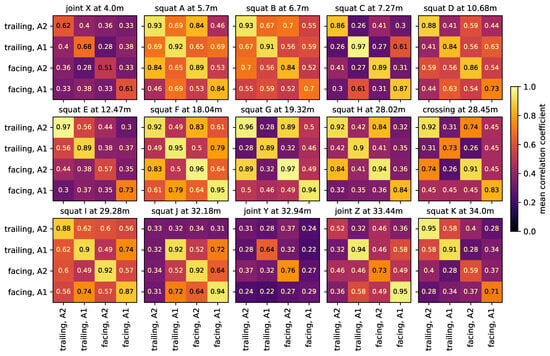 Figure 7 shows the mean correlation coefficients between impact event time series of different directions and axles for each impact event origin in the experiment. In each plot, the diagonal contains the average of correlation coefficients between different impact events with the same driving direction and axle. For each impact event origin, there is also little variation in bogie speed between impacts of a given direction and axle. Overall, these values are consistently high (mean 0.82), indicating that the waveform of impact events caused by the same origin remain similar if all other factors remain the same. The non-diagonal elements are the average of correlation coefficients between impact events with two different combinations of driving direction and axle. Here, the bogie speed can vary slightly more. For some combinations, the correlation coefficients are still relatively high, but often, this is not the case (mean 0.47). This shows that, if at least one factor changes, the waveforms can vary drastically. All these observations also hold true for the energy spectral densities.